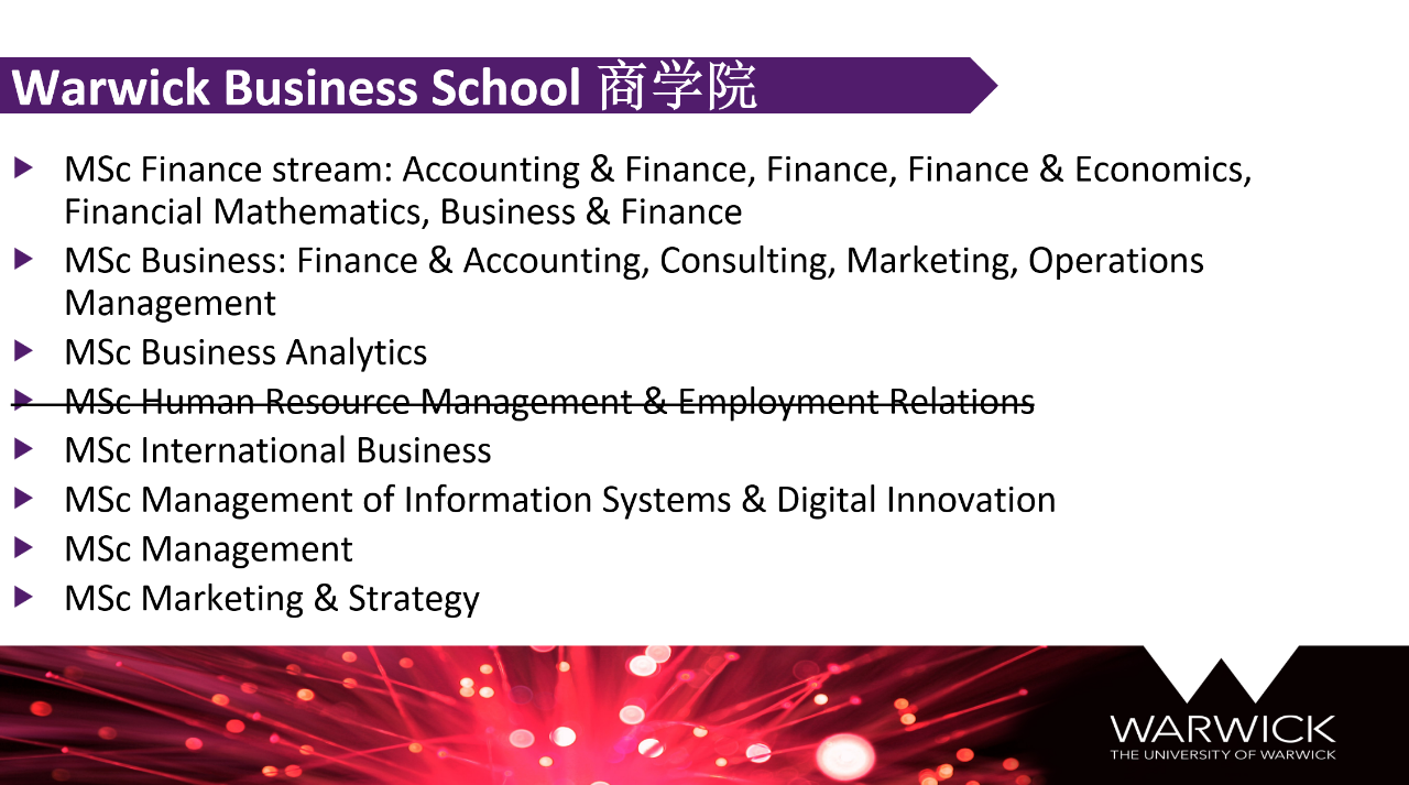 本科是经济学的同学,可以申请华威大学商学院的金融与经济学Finance & Economics硕士课程,这个课程专门为本科是经济学但是在硕士阶段想要进入金融领域的申请人而设置的。对于没有会计/金融背景的学生,大学也设置了Business with Accouting and Finance专业。Antonia介绍了商学院独特的专业——商务分析(MSc Business Analytics)、运营管理专业(Business with Operations Management)与信息系统管理和技术创新专业(Business with Management of Information Systems and Digital Innovation)。