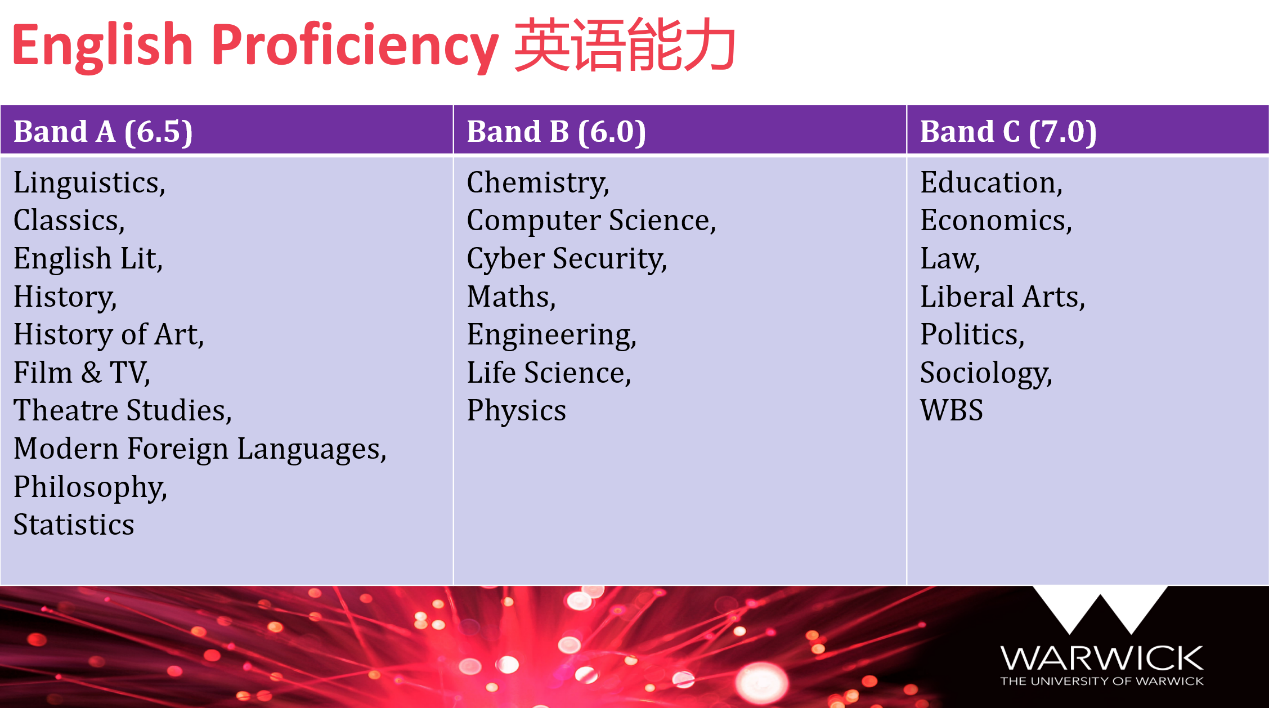 华威大学大部分硕士研究生课程对雅思成绩的要求在6.5-7.5之间,不是所有的学院都接受通过参加语言课来满足课程的语言要求。建议申请的时候需要准备雅思、PTE或者托福等语言考试,获得Offer之后再开始准备这些考试时间就不太充足了。研究生申请除了递交学术背景、语言成绩、推荐信(一般申请时需要递交推荐人联系信息,推荐人会收到大学的邮件上传推荐信)、个人陈述以外,部分学院也有额外的要求。如商学院明确要求,递交申请时,建议提交个人CV,如果是大四学生申请,暂时无法提供大学本科4年所有的成绩单,也建议提供大四学科课程的列表,以便学院收到申请后了解申请人本科学习期间的课程。学费方面,每个专业的学费都不尽相同,在大学学费列表有列出不同专业的费用信息。金融、管理等方向专业的学费会略高于其他社科方向及人文方向的专业。