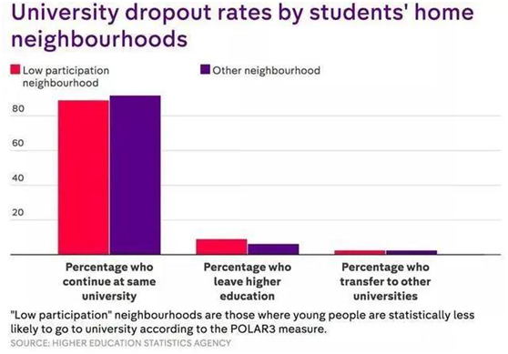 为了让大家更直观的感受到自己学校考试的通过率,前段时间,英国高等教育统计局 HESA(Higher Education Statistics Agency)还专门调查了英国191家提供大学高等教育的学校/机构,并根据158所大学/机构提供的有效数据,统计了英国各个大学的第一学年通过率,转学率和辍学率,可以作为大家择校时的参考标准之一。