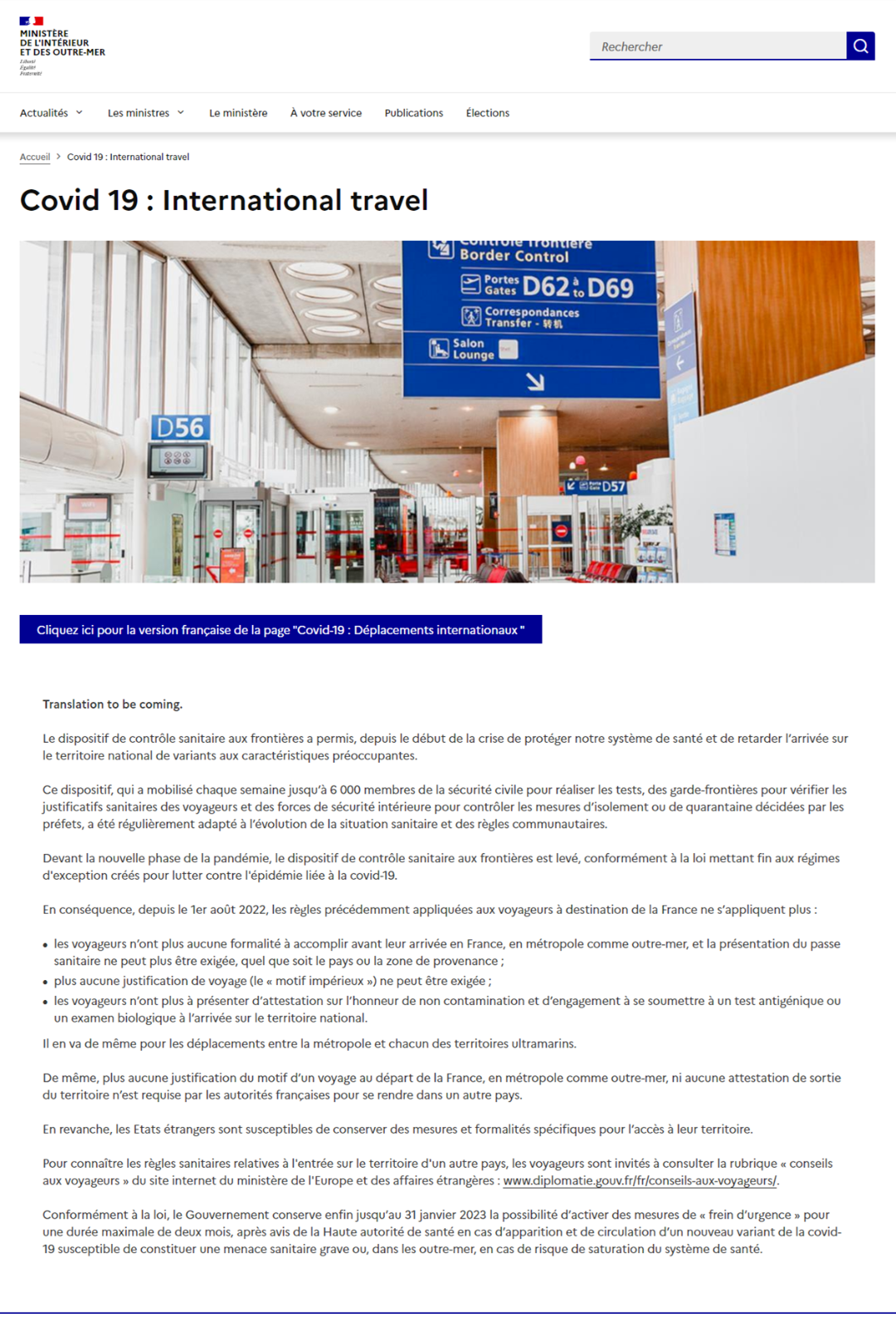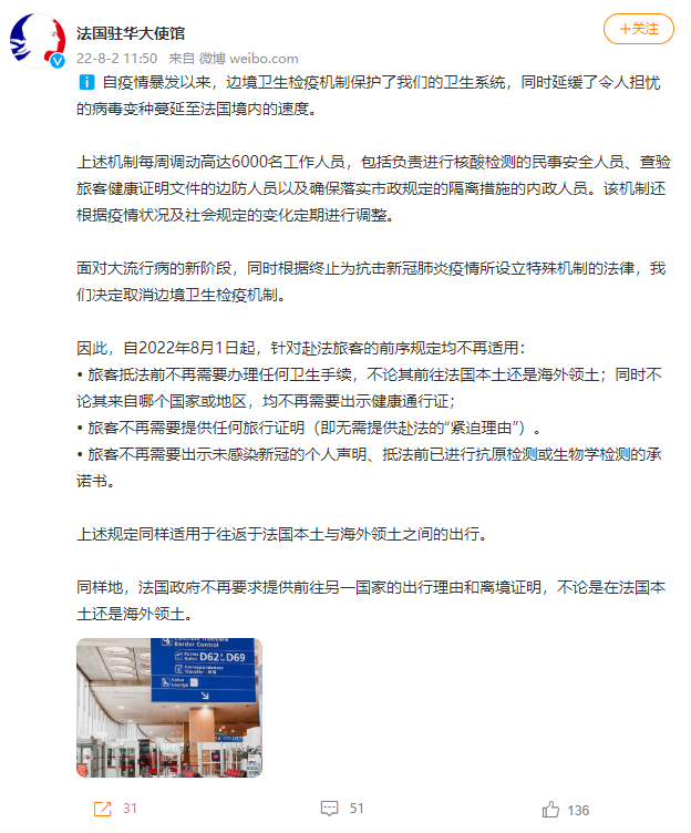? 旅客不再需要出示未感染新冠的个人声明、抵法前已进行抗原检测或生物学检测的承诺书。