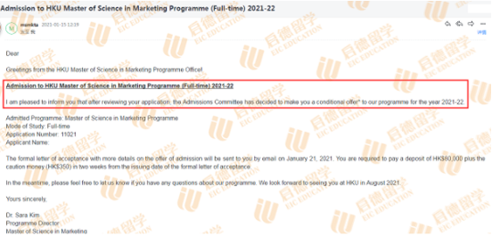 2021年1月15日收到香港大学MSc in Marketing和Master of Global Management专业预录取邮件,正式录取将于2-3周内发放。