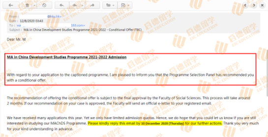 12月8收到港大MA in Development China Studies专业预录取邮件。