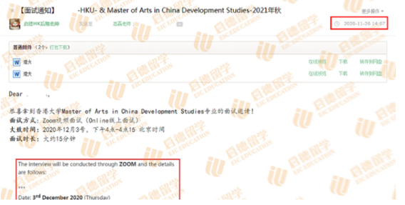 2020年11月26日W同学收到了香港大学MA in Development China Studies专业发来的面试通知。