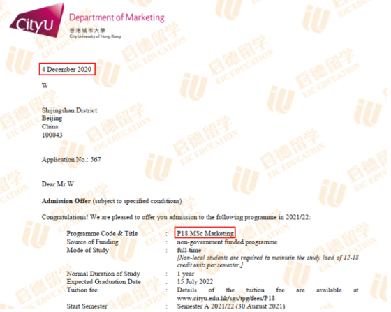 12月4日收到了第一个offer,香港城市大学MSc in Marketing专业。