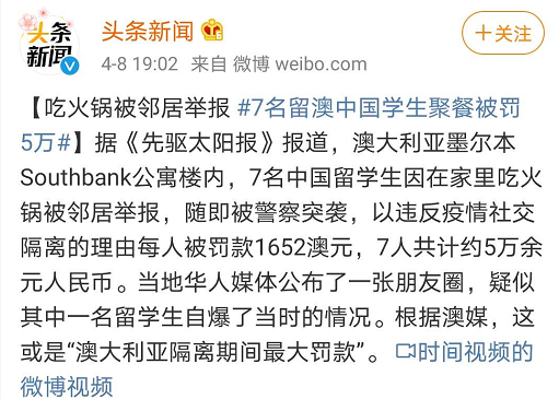 上周,在墨尔本公寓内,有7名中国留学生聚会吃火锅,结果被邻居举报了~澳洲警察收到举报后,马上突袭公寓,最后7个人每人被罚款1652澳元,共计约5万多元人民币。
