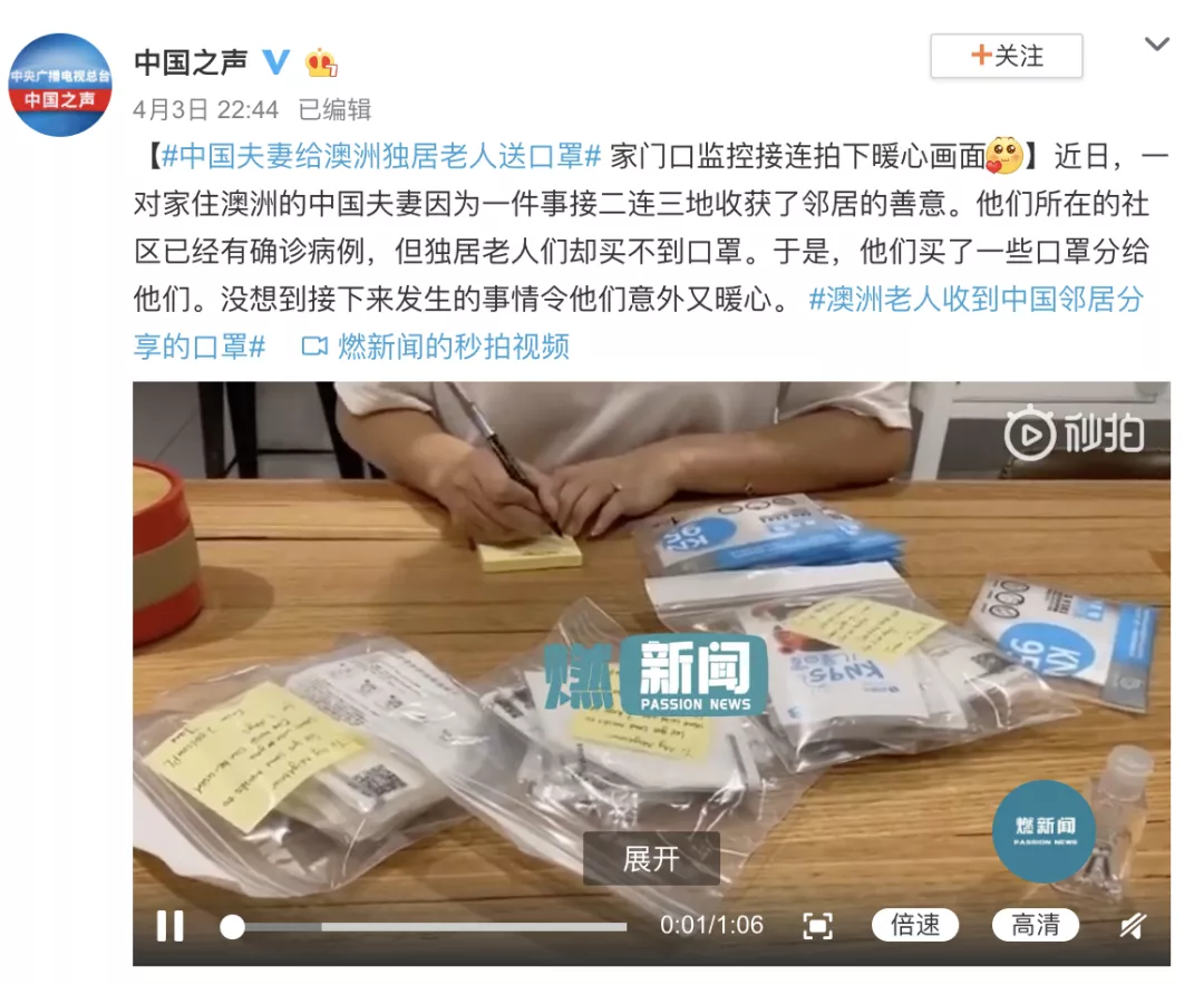 一对家住澳洲的中国夫妇,把自己囤的口罩分给社区里的独居老人。