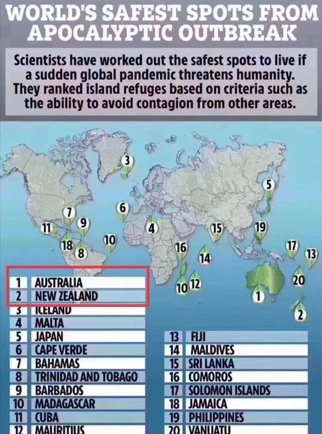 世卫专家也说过,澳大利亚和新西兰国土环境独立于其他国家,人口密度低,不利于疾病的传染。刚出炉的国际最安全避难场所排名也证明了专家的判断。