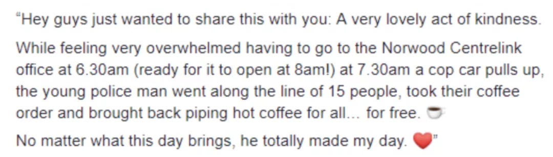 阿德莱德一位年轻警察,为排队申请领取救济金的人送上免费咖啡。