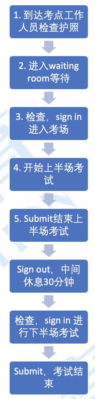 5. 不管是答完上半场的题选择中场休息,还是紧急上厕所,一定先挥手示意工作人员过来!工作人员进场前会有讲解。出考场只能带护照和号码牌出来,只要出考场都要重复 sign out和 sign in。