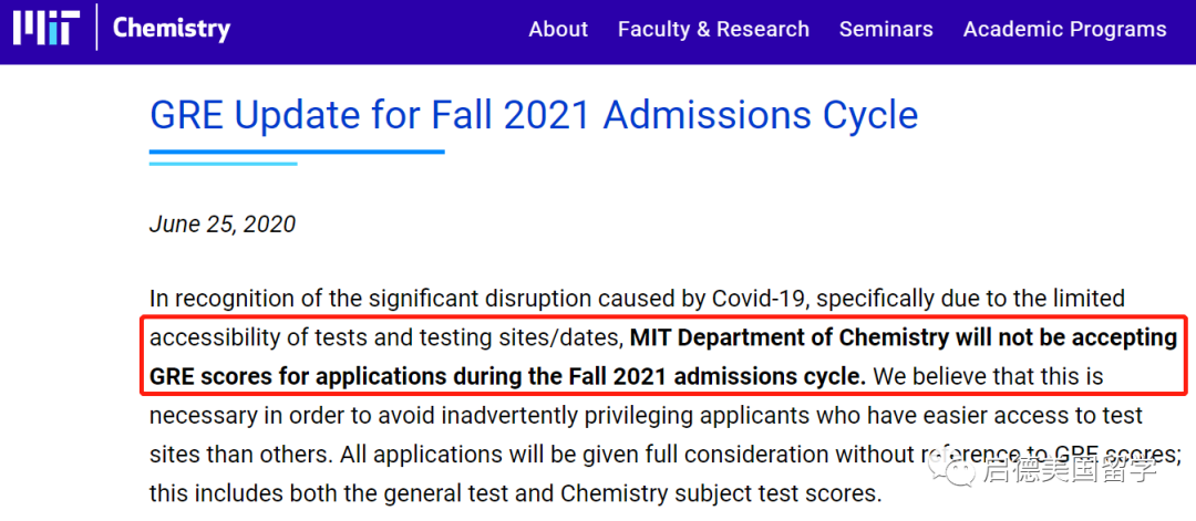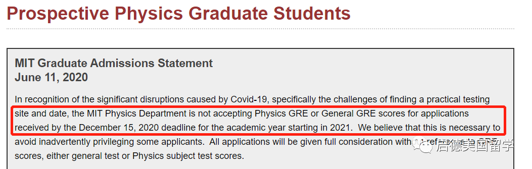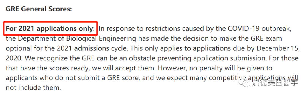 多个院系取消GRE要求。生物工程系针对2020年12月15日前提交申请的申请人取消GRE强制要求,改为Optional;化学系将不接受2021Fall申请人的GRE成绩;物理系将不接受2020年12月15日之前提交的2021Fall申请人的GRE成绩,避免无意中给予更容易参加考试的申请人“特权”而有失公平。