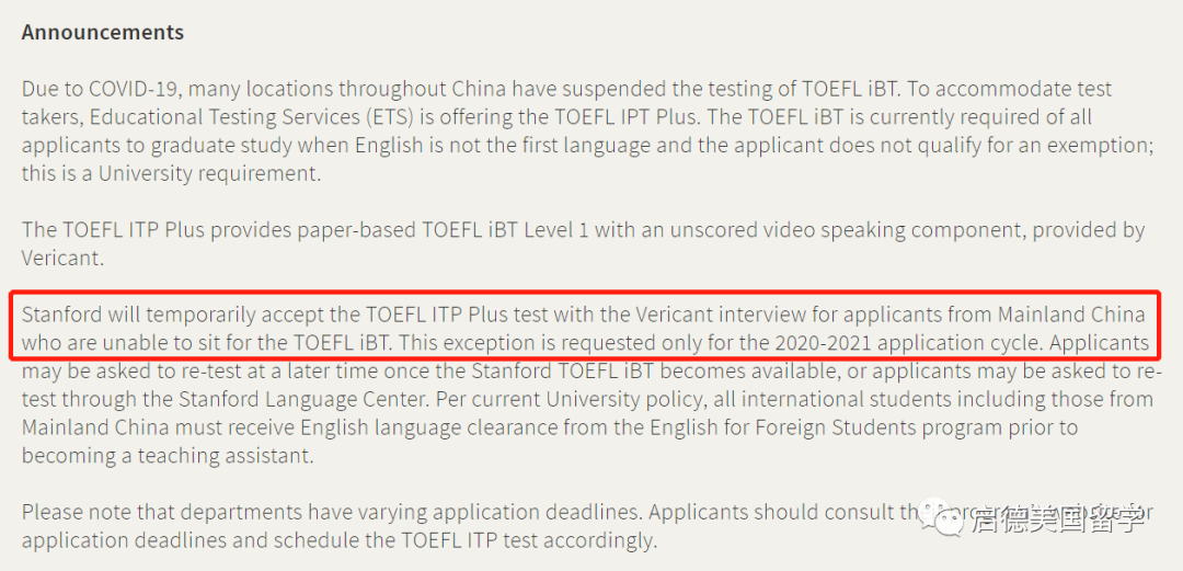 1. 2020-2021申请季暂时接受中国学生提交TOEFL ITP考试成绩,但之后可能会要求重新参加TOEFL iBT考试或斯坦福语言中心的测试
