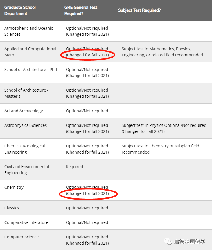 普林斯顿大学曾在2019年9月宣布14个研究生专业将不再以GRE成绩作为硕士和博士项目录取的必要条件,而针对计划2021 Fall的申请人,更多研究生专业调整GRE要求,改为Optional,包括计算机科学、电子工程、建筑、机械与航空航天工程、神经科学、东亚研究等中国学生常申专业。
