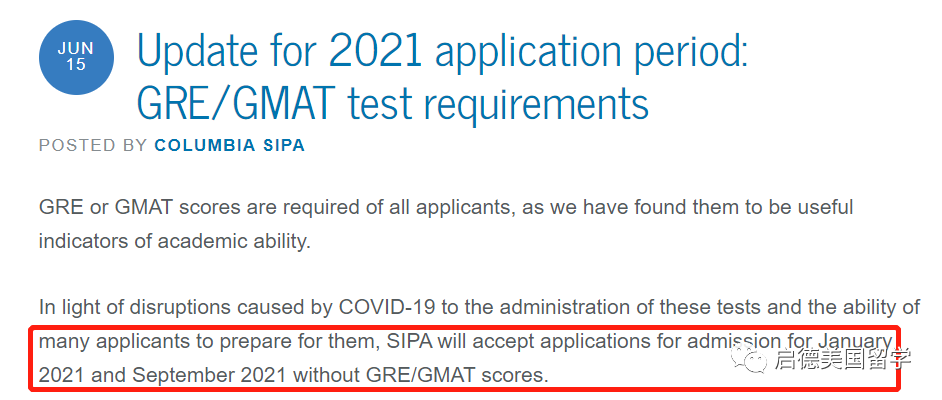 2. 哥伦比亚国际与公共事务学院SIPA针对2021年1月入学与2021年9月入学的申请人,取消GRE/GMAT要求
