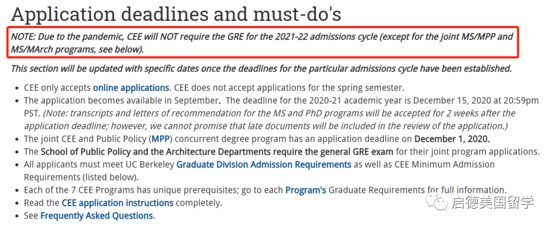 针对2021Fall的申请人,加州大学伯克利分校经济系宣布不考虑申请人的GRE成绩;土木与工程学院宣布无需提供GRE成绩(MS/MPP以及MS/MArch联合项目除外)