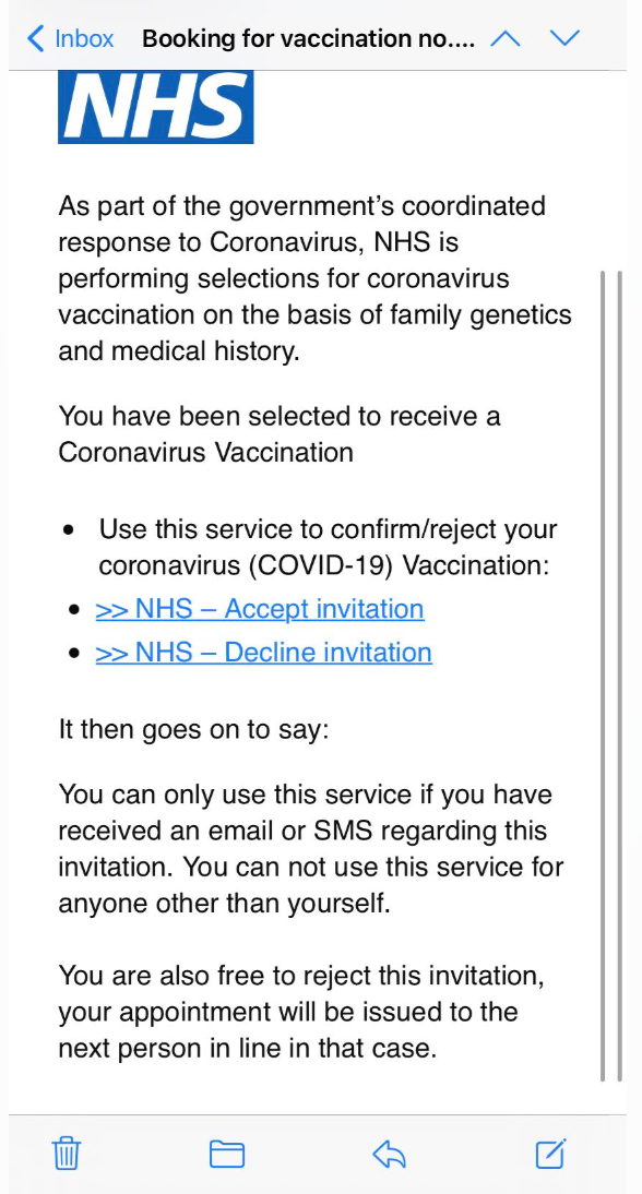 最近,相信不少在英国的同学,都收到了这样一封神秘邮件(如下图所示)。邮件名一般为:Book now NHS-Vaccination number。