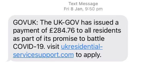 还有一些同学最近可能收到了这样的短信,短信煞有介事地说,“为了维持英国政府的抗疫战,英国政府要求所有英国民众交付284.76镑”。如果遇到这种情况,也请大家直接忽视,不要点开链接。