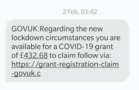 第三种最近常见的诈骗形式就是利用人人都想占小便宜的心态,获取你的个人信息。比如,最近小启的一位同事就收到了这样的短息,表示由于疫情影响,政府决定给你432镑作为补助,点下方链接进行申请。