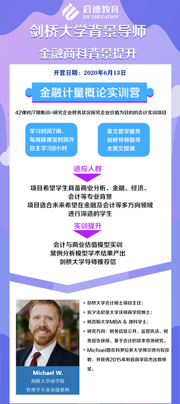 英国剑桥会计实训项目直接关联ACCA内容,英国剑桥导师亲自参与讲解会计实训。通过实训项目熟悉会计基础三大财务报表,灵活运用财务报表解决公司企业财务、金融问题掌握财务分析技巧及财务比率分析技能。金融计量概论实训营6月13日火热开营,名额有限,先到先得。