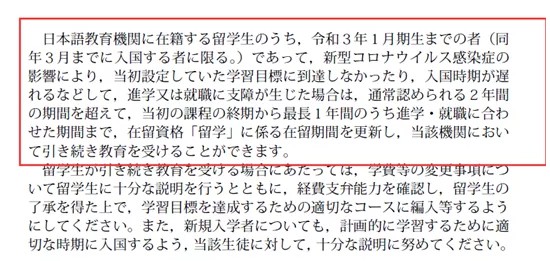 另外,由于疫情影响,一部分选择语言学校升学的同学无法在“在留资格”的有效期内完成毕业,对接下来的升学、工作计划造成了很大影响。对此,日本法务省发布新策,表示21年1月前入学日本语言学校的在籍生们,如若因为疫情影响无法按时毕业者,可在原先规定2年的在学限制上,延缓1年的“留学”在留资格,继续在在籍的日本语言学校学习1年。