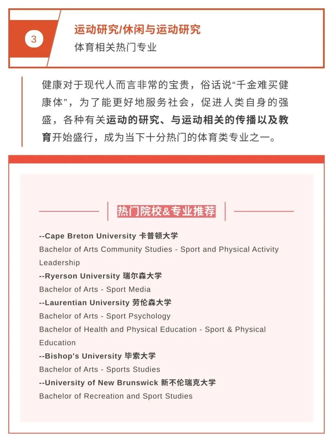 体育管理是涉及体育商业方面的管理,属于体育与商科的“交叉学科”,其主要包括职业体育管理、学院体育管理、娱乐体育管理、体育市场营销、活动管理、设施管理、体育经济学、体育金融学和体育信息学等,涉及的方面比较广泛。 随着近些年人们对健康的需求不断增大,各种运动团体、俱乐部以及营养学显著发展,导致社会对于运动技术方面的人才产生极大的需求,加拿大体育运动管理专业可以说是当下发展前景最为可观的优势专业。 学生毕业后可以负责体育赛事的组织宣传及俱乐部的管理等工作,服务于各种体育俱乐部、体育协会或做体育经纪人。 热门院校推荐 --University of Waterloo 滑铁卢大学 Bachelor of Arts - Recreation and Sport Business (Co-op) --Brock University 布鲁克大学 Bachelor of Sport Management --University of Windsor 温莎大学 Bachelor of Human Kinetics (Honours) - Sport Management and Leadership (Co-op) --University of Guelph 圭尔夫大学 Bachelor of Commerce - Sport and Event Management (Co-op) --Vancouver Island University 温哥华岛大学 Bachelor of Tourism Management - Recreation and Sport Management (Co-op) --Trinity Western University 西三一大学 Bachelor of Human Kinetics - Sports and leisure Management --University of Regina 里贾纳大学 Bachelor of Sport and Recreation Studies - Sports and Recreation Management --Laurentian University 劳伦森大学 Bachelor of Commerce - Sports Administration --Brandon University 布兰登大学 Bachelor of Physical Education - Recreation & Sport Management 其实除了大学,加拿大最有特色的学院教育也开设许多体育管理方向的研究生文凭课程: --Fanshawe College 范莎学院 Sport and Event Marketing --George Brown College 乔治布朗学院 Sport and Event Marketing --Humber College 汉博学院 Sport Business Management --Algonquin College 亚岗昆学院 Sport Business Management --Seneca College 圣力嘉学院 Event Marketing - Sports, Entertainment, Arts