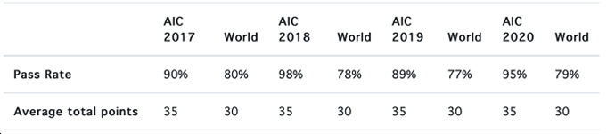 AIC是新西兰唯一一所专注于提供全IB课程的私立高中,高学术标准和培养有国际意识及责任感的世界公民是AIC的核心价值。AIC的教学方式兼纳了东西方教学的特点,既注重东方教学对基础教育的重视,AIC的学生课后必须完成一定量的调研、社会活动和家庭作业,同时也注重西方教育提倡辩证思维和对多元文化的尊重。AIC也是新西兰唯一一所同时提供PSAT、SAT和ACT的考试中心。AIC历年的IB平均成绩及IB文凭通过率均远高于全球平均水平:因此AIC的毕业生去向通常是:牛津、剑桥、斯坦福、芝加哥、帝国理工、宾夕法尼亚、UCL、清华、北大、多伦多大学、新加坡国立、澳国立、墨尔本大学等QS世界排名前50的高等学府。AIC开设的11年级pre-IB课程与AIC新西兰教室中讲授的课程一致,为海外国际生提供以下多个方面的系统学习与训练:使学生具备知识,技能,态度和概念的基础,以慢慢渗透IB国际文凭课程;